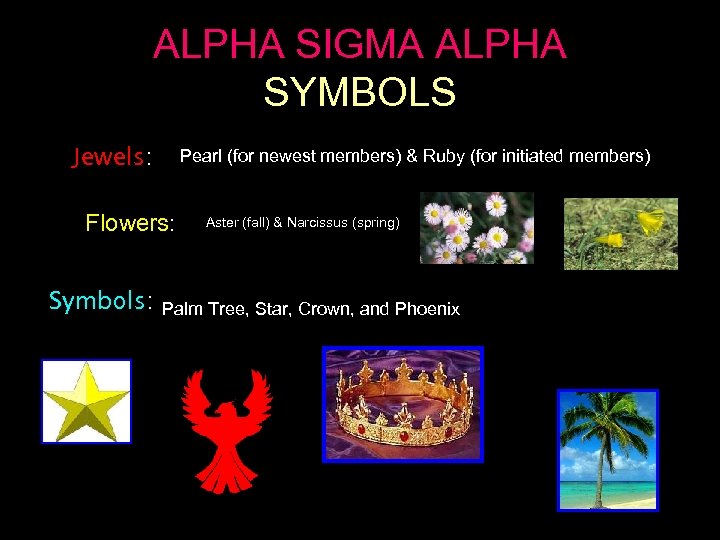 ALPHA SIGMA ALPHA SYMBOLS Pearl (for newest members) & Ruby (for initiated members) Jewels: Aster (fall) & Narcissus (spring) Flowers: Symbols: Palm Tree, Star, Crown, and Phoenix