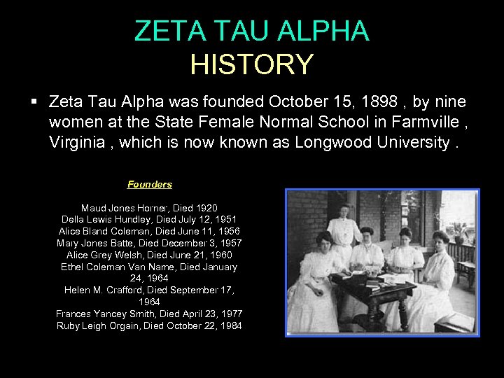 ZETA TAU ALPHA HISTORY § Zeta Tau Alpha was founded October 15, 1898 , by nine women at the State Female Normal School in Farmville , Virginia , which is now known as Longwood University. Founders Maud Jones Horner, Died 1920 Della Lewis Hundley, Died July 12, 1951 Alice Bland Coleman, Died June 11, 1956 Mary Jones Batte, Died December 3, 1957 Alice Grey Welsh, Died June 21, 1960 Ethel Coleman Van Name, Died January 24, 1964 Helen M. Crafford, Died September 17, 1964 Frances Yancey Smith, Died April 23, 1977 Ruby Leigh Orgain, Died October 22, 1984