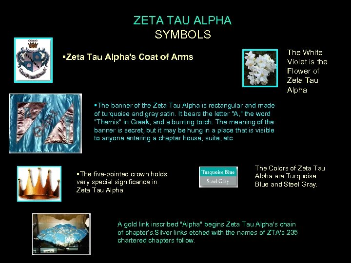 ZETA TAU ALPHA SYMBOLS The White Violet is the Flower of Zeta Tau Alpha §Zeta Tau Alpha's Coat of Arms §The banner of the Zeta Tau Alpha is rectangular and made of turquoise and gray satin. It bears the letter "A, " the word "Themis" in Greek, and a burning torch. The meaning of the banner is secret, but it may be hung in a place that is visible to anyone entering a chapter house, suite, etc §The five-pointed crown holds very special significance in Zeta Tau Alpha. The Colors of Zeta Tau Alpha are Turquoise Blue and Steel Gray. A gold link inscribed "Alpha" begins Zeta Tau Alpha's chain of chapter’s. Silver links etched with the names of ZTA's 235 chartered chapters follow.