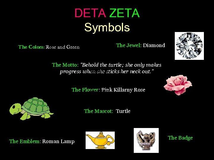 DETA ZETA Symbols The Jewel: Diamond The Colors: Rose and Green The Motto: "Behold the turtle; she only makes Emblem progress when she sticks her neck out. " The Flower: Pink Killarny Rose Roman Lamp The Mascot: Turtle The Emblem: Roman Lamp The Badge