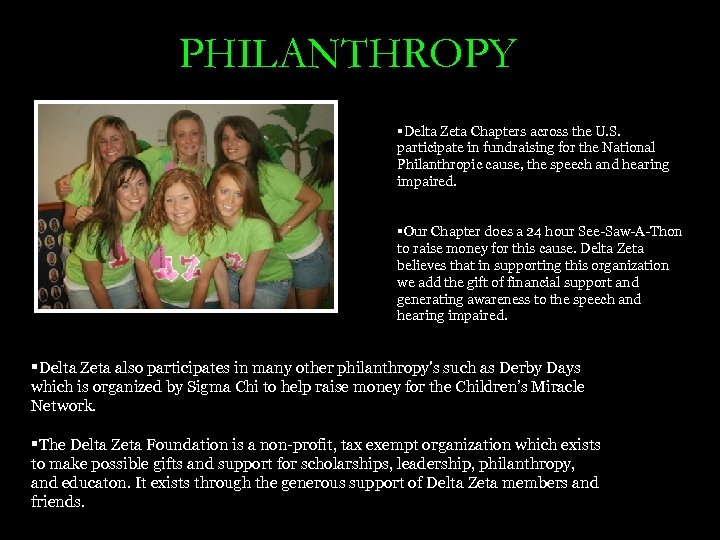 PHILANTHROPY §Delta Zeta Chapters across the U. S. participate in fundraising for the National Philanthropic cause, the speech and hearing impaired. §Our Chapter does a 24 hour See-Saw-A-Thon to raise money for this cause. Delta Zeta believes that in supporting this organization we add the gift of financial support and generating awareness to the speech and hearing impaired. §Delta Zeta also participates in many other philanthropy's such as Derby Days which is organized by Sigma Chi to help raise money for the Children’s Miracle Network. §The Delta Zeta Foundation is a non-profit, tax exempt organization which exists to make possible gifts and support for scholarships, leadership, philanthropy, and educaton. It exists through the generous support of Delta Zeta members and friends.