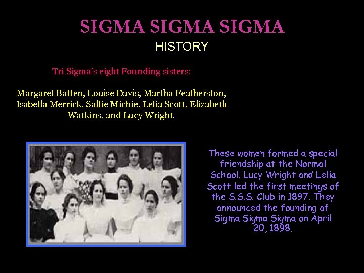 SIGMA HISTORY Tri Sigma's eight Founding sisters: Margaret Batten, Louise Davis, Martha Featherston, Isabella Merrick, Sallie Michie, Lelia Scott, Elizabeth Watkins, and Lucy Wright. These women formed a special friendship at the Normal School. Lucy Wright and Lelia Scott led the first meetings of the S. S. S. Club in 1897. They announced the founding of Sigma on April 20, 1898.