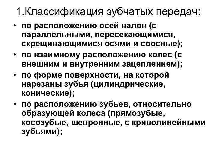 1. Классификация зубчатых передач: • по расположению осей валов (с параллельными, пересекающимися, скрещивающимися осями и соосные); • по взаимному расположению колес (с внешним и внутренним зацеплением); • по форме поверхности, на которой нарезаны зубья (цилиндрические, конические); • по расположению зубьев, относительно образующей колеса (прямозубые, косозубые, шевронные, с криволинейными зубьями);