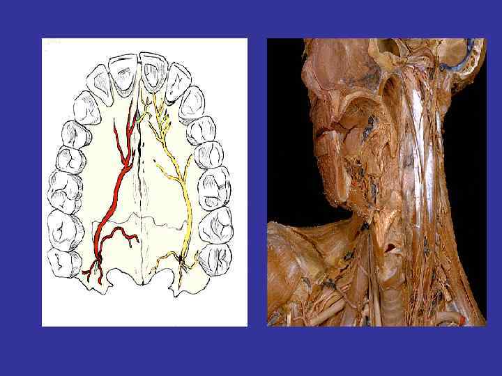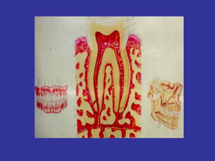 Кровоснабжение и иннервация зубов Кровоснабжение: • Иннервация: из системы верхнечелюстной артерии 1. для верхней челюсти – передние (резцы, клыки) и задние (премоляры и моляры) верхние альвеолярные артерии 1. 2. для нижней челюсти – нижняя альвеолярная артерия 2. для верхней челюсти – верхние альвеолярные нервы от подглазничного нерва 2 й ветви V пары (образует верхнее зубное сплетение) для нижней челюсти – нижние альвеолярные нервы от нижнечелюстного нерва V пары (образует нижнее зубное сплетение)