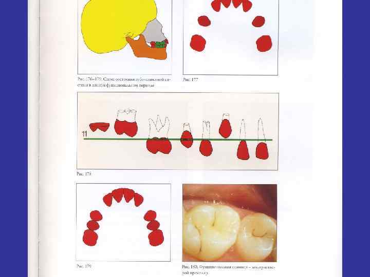 Стертость зубов • 0 баллов - полное отсутствие стираемости • 1 балл – появление сошлифованных поверхностей на коронках (16 -18 лет) • 2 балла – появление участков дентина на режущих краях и бугорках (20 -30 лет) • 3 балла – появление больших участков дентина со стиранием всех выступающих частей коронки (30 -50 лет) • 4 балла – полное стирание эмали на жевательной поверхности, частичное стирание коронки (40 -60 лет) • 5 баллов – стирание половины коронки (60 -70 лет) • 6 баллов – полное стирание коронки до уровня шейки(60 лет и более)