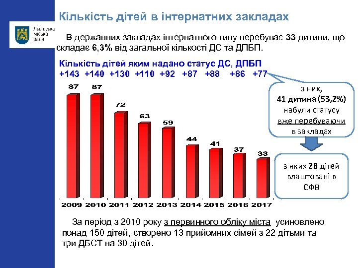 Кількість дітей в інтернатних закладах В державних закладах інтернатного типу перебуває 33 дитини, що складає 6, 3% від загальної кількості ДС та ДПБП. Кількість дітей яким надано статус ДС, ДПБП +143 +140 +130 +110 +92 +87 +88 +86 +77 з них, 41 дитина (53, 2%) набули статусу вже перебуваючи в закладах з яких 28 дітей влаштовані в СФВ За період з 2010 року з первинного обліку міста усиновлено понад 150 дітей, створено 13 прийомних сімей з 22 дітьми та три ДБСТ на 30 дітей.