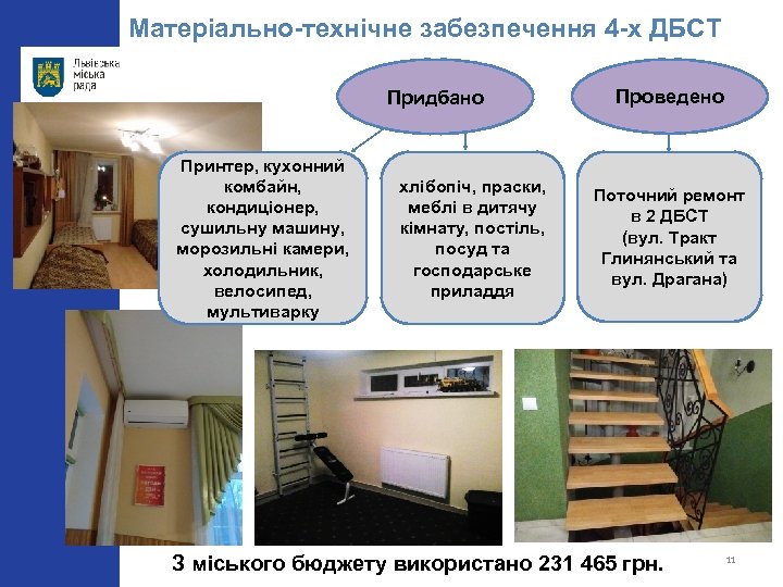 Матеріально-технічне забезпечення 4 -х ДБСТ Придбано Принтер, кухонний комбайн, кондиціонер, сушильну машину, морозильні камери, холодильник, велосипед, мультиварку хлібопіч, праски, меблі в дитячу кімнату, постіль, посуд та господарське приладдя Проведено Поточний ремонт в 2 ДБСТ (вул. Тракт Глинянський та вул. Драгана) З міського бюджету використано 231 465 грн. 11