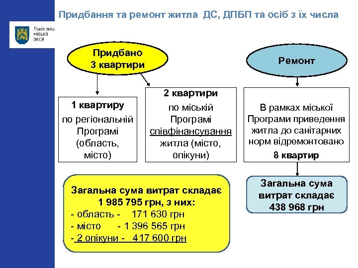 Придбання та ремонт житла ДС, ДПБП та осіб з їх числа Придбано 3 квартири 1 квартиру по регіональній Програмі (область, місто) Ремонт 2 квартири по міській Програмі співфінансування житла (місто, опікуни) Загальна сума витрат складає 1 985 795 грн, з них: - область - 171 630 грн - місто - 1 396 565 грн - 2 опікуни - 417 600 грн В рамках міської Програми приведення житла до санітарних норм відремонтовано 8 квартир Загальна сума витрат складає 438 968 грн