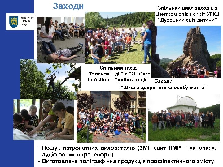Заходи Спільний цикл заходів з Центром опіки сиріт УГКЦ “Духовний світ дитини” Спільний захід “Таланти в дії” з ГО “Care in Action – Турбота в дії” Заходи “Школа здорового способу життя” - Пошук патронатних вихователів (ЗМІ, сайт ЛМР – «кнопка» , аудіо ролик в транспорті) - Виготовлена поліграфічна продукція профілактичного змісту