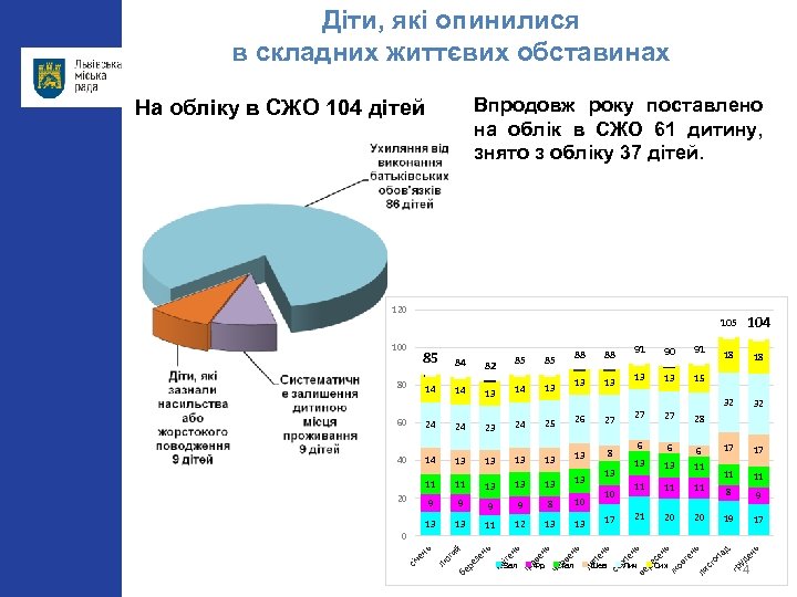 Діти, які опинилися в складних життєвих обставинах Впродовж року поставлено на облік в СЖО 61 дитину, знято з обліку 37 дітей. На обліку в СЖО 104 дітей 120 10 13 13 11 12 13 13 пе ь Гал Шев ли ен рв Фр че ен ав Зал тр нь кв іте зе й ре ти бе лю січ ен ь 0 17 8 9 21 10 20 20 19 17 Лич Сих ь 8 ен 9 11 уд 9 11 ад 9 11 11 гр 9 20 11 оп 13 11 ст 13 6 13 ен ь 13 ь 11 нь 11 17 6 13 13 13 17 6 8 ли 13 вт 13 ь 13 28 жо 13 13 25 27 ен 14 24 15 27 27 13 ь 40 23 24 26 32 13 13 91 ре с 24 13 18 90 ен 60 14 18 91 88 13 13 104 32 14 82 88 85 ве 14 85 рп 84 нь 80 85 се 100 105 4