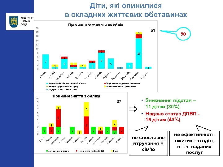 Діти, які опинилися в складних життєвих обставинах Причини постановки на облік 20 18 16 14 12 10 8 6 4 2 0 61 1 2 1 3 ь ен уд Гр ст оп нь ад 1 Ли ов те Ж се нь 1 Ве ре нь 5 пе нь пе Ли ь ве н нь Че р ав е Ухиляння від батьківських обов'язків Найгірші форми дитячої праці ДС, ДПБП з АР Крим або АТО 8 1 3 1 1 Тр Кв іте ре зе нь й Бе 1 1 1 нь 5 1 1 Лю ти Сі че нь 7 15 Се р 1 50 Жорстоке поводження з дитиною Залишення місця проживання 37 • Зникнення підстав – 11 дітей (30%) • Надано статус ДПБП 16 дітям (43%) не своєчасне втручання в сім'ю не ефективність вжитих заходів, в т. ч. наданих послуг
