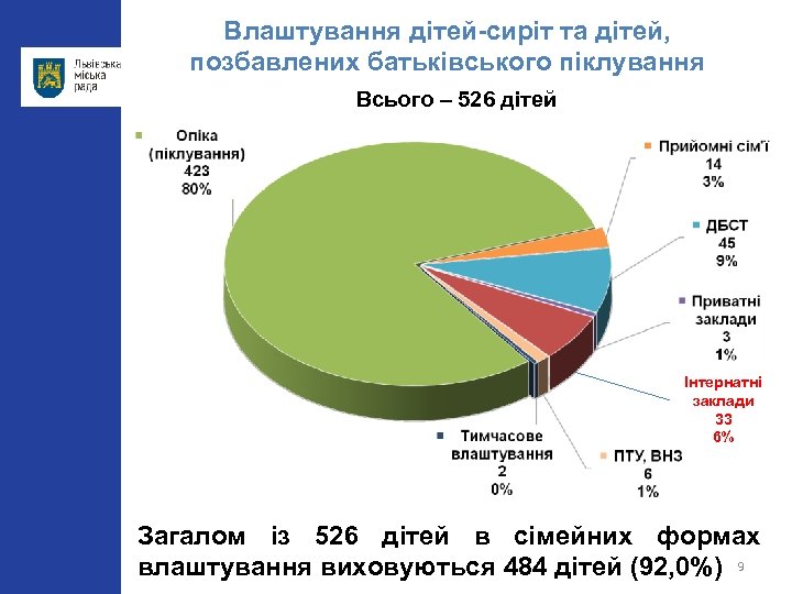 Влаштування дітей-сиріт та дітей, позбавлених батьківського піклування Всього – 526 дітей Інтернатні заклади 33 6% Загалом із 526 дітей в сімейних формах влаштування виховуються 484 дітей (92, 0%) 9