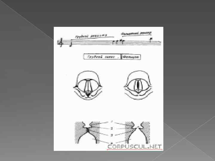 Виды звукообразования: Грудной регистр – под напором воздуха из нижнего резонатора голосовая щель открывается благодаря эластичности и упругости голосовых складок. После растяжения и отклонения кверху наступает фаза возврата и голосовая щель вновь смыкается, затем цикл повторяется. При этом происходит вибрация струи воздуха над голосовыми складками и одновременно вибрируют голосовые складки. Они совершают движения в поперечном направлении, внутрь и наружу, перпендикулярно струе выдыхаемого воздуха. Частота колебательных движений голосовых складок соответствует высоте издаваемого тона, т. е создается звук.