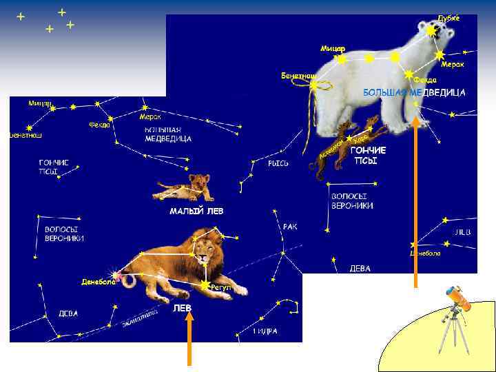 Значками разной величины на карте показаны звёзды от ярчайших до менее заметных. Каждая звезда имеет своё название. Самые яркие из них – Полярная звезда, Вега и др.